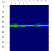 内部欠陥の探査で、線上の測定ではソナー図で欠陥の位置、またみかけの弾性波速度の低下度合いから欠陥の大きさを推定します。面的な測定を行った場合、みかけの弾性波速度の低下度合いをコンター図とすることによって、シースの位置充填度合いなどの推定が可能です。